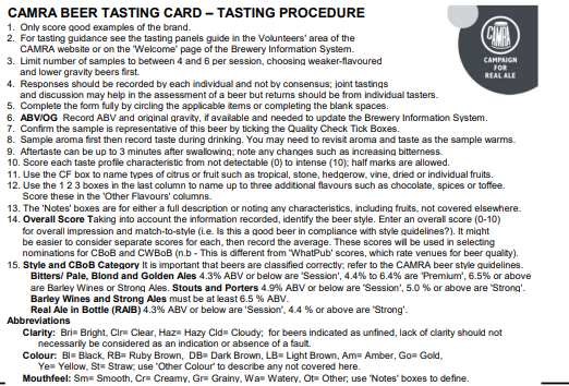 CAMRA Tasting Panels are responsible for tasting all the real ales that are regularly brewed within their area, and for submitting the descriptions to CAMRA’s Good Beer Guide. Please note that the Tasting Panel descriptions herein are the long versions - which need to be abridged due to space restrictions within the GBG. They also put forward beers to CAMRA’s Champion Beer of Britain Competition. The Tasting Card (click to expand), shows how comprehensive the assessment is.